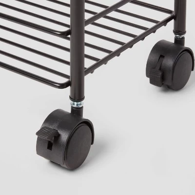 Keep your bath space maintained in style using this Metal Shower Caddy Tower from Room Essentials™. Standing on a metal frame, this shower caddy features three built-in shelves to provide ample space for your bath accessories, while providing easy access with the open design. It comes with castor wheels to make moving around the space easy. In a black color, this metal shower caddy suits all your bath settings.